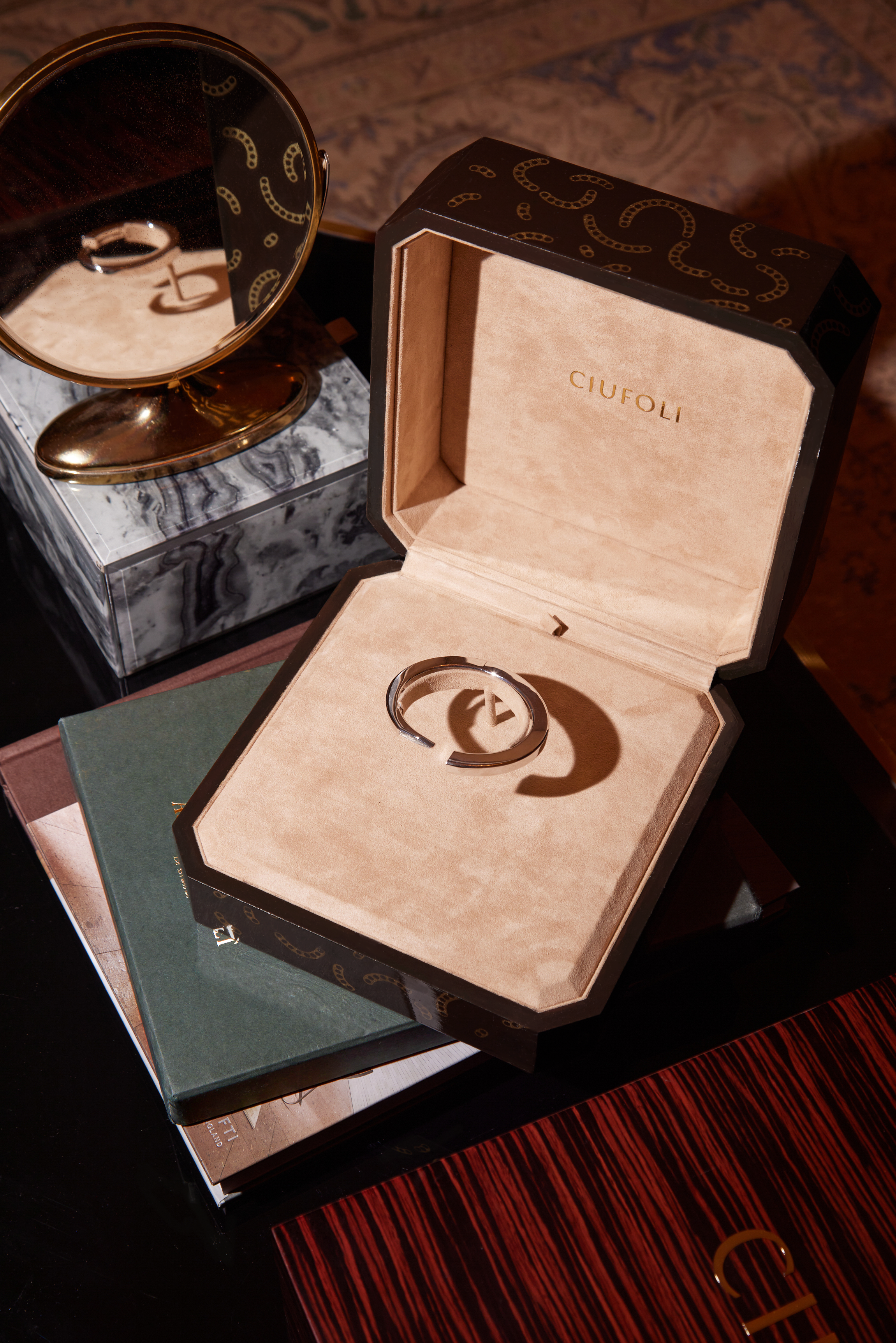 CIUFOLI elevates presentation to an art. Each case is handcrafted in fine wood, lined in Alcantara and signed in satin-brass lettering; the jewel rests in suspension. Select cases are hand-painted in Florence to mirror the individuality of the work. More than packaging, the case is a collectible object — an expression of craft, discretion and true luxury.
